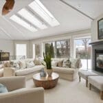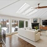 A sophisticated living and dining room leads you to the heart of the home, a magnificent family room extending across the back of the house with stunning skylights that shower the room with endless sunshine. An impressive gas fireplace invites you to gather around and enjoy serene views of the private, pool-sized back garden.