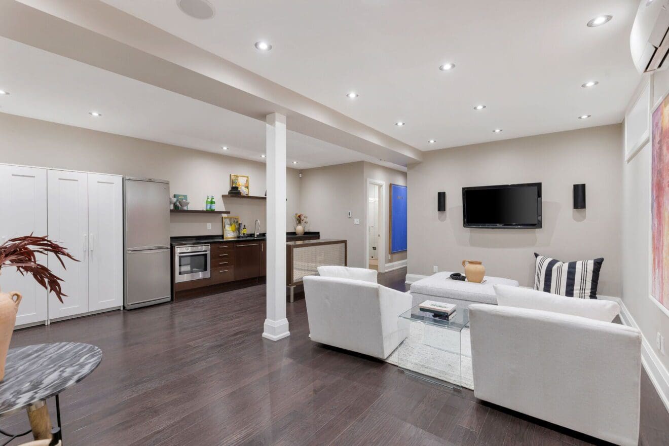 The lower level is designed with versatility in mind, featuring a separate entrance, high ceiling height, one bedroom with built-in his and her closets, a full galley kitchen, three-piece bathroom, and a laundry room with dog wash station. This area is ideal for a family room, media room, or a nanny suite or even a teen’s dream mini apartment, offering flexibility to meet your needs.