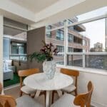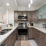 The modern kitchen is a dream–sleek finishes, thoughtful details, and an effortless connection to the main living spaces, all set against the backdrop of a quiet courtyard view.