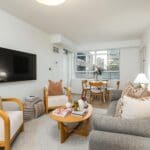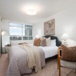 The sizable primary bedroom boasts a generous walk-in closet and a beautifully appointed four-piece ensuite bathroom with laundry, elevating everyday convenience. Equally spacious, the second bedroom combines practicality with style, offering a built-in storage bed and ample closet space, adjacent to a chic three-piece guest bathroom.