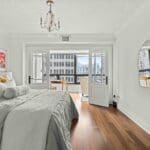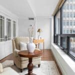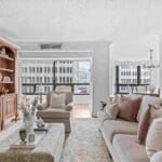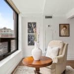 The residence features two spacious bedrooms and two exquisitely appointed bathrooms, complemented by a generously proportioned formal living room and a sun-filled solarium. Expansive windows showcase breathtaking views of the tree-lined streets, filling the home with natural light.