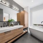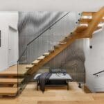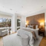A sculptural staircase ascends beside a dramatic 27-foot feature wall crowned by a skylight, drawing natural light deep into the home. Upstairs, the primary suite offers a calm retreat with custom wall-to-wall built-in closets, floor-to-ceiling windows, and a spa-inspired ensuite with a walk-in shower and deep soaking tub. Three additional generously sized bedrooms are complemented by a beautifully finished four-piece family bathroom featuring two sleek vanities, contemporary fixtures, and elevated tilework. A well-designed laundry room- illuminated by its own skylight- completes the second level.