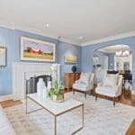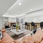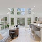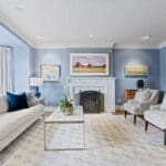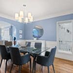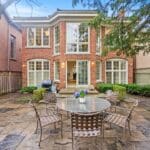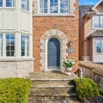 Inside, a spacious foyer greets you through a beautiful arched doorway. A comfortable living room displays a lovely wood-burning fireplace and a large bay window overlooking the expansive front garden. The formal dining room leads you to a magnificent sunken family room showcasing incredible double-height ceilings with a walk-out to an enchanting back garden featuring a beautiful stone fountain. The spacious chef’s kitchen includes a large centre island with ample storage space.