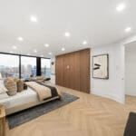 Inside, the suite reveals a level of finish that feels warm, elevated and beautifully cohesive. The custom kitchen is designed for those who love to cook and gather — complete with Miele appliances, tailored cabinetry and an impressive oversized centre island that acts as a striking focal point. Chevron-patterned white oak floors carry throughout, tying the home together with warmth and timeless character. The kitchen flows into expansive living and dining areas, creating an effortless backdrop for hosting or unwinding.