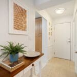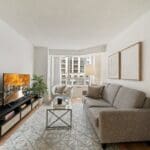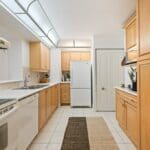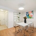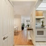 A generous kitchen with ample cabinetry overlooks the open-concept living and dining area, creating a functional layout ideal for both everyday living and entertaining. Elegant wainscoting adds character to the living and dining rooms, while a large living room window fills the space with natural light and enhances the airy feel of the home.