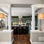 The second level brings together the home’s principal living spaces in a richly layered setting, suited as easily to daily life as to evenings spent entertaining. A beautifully appointed kitchen sits comfortably within the layout, featuring a generous island, an integrated desk area, and a small deck just beyond- an easy spot for morning coffee or a moment of fresh air. The kitchen opens naturally into an elegant dining room and a light-filled living room, where a gas fireplace and oversized windows create warmth and atmosphere. Throughout, carefully detailed mouldings lend a sense of depth and timeless craftsmanship.